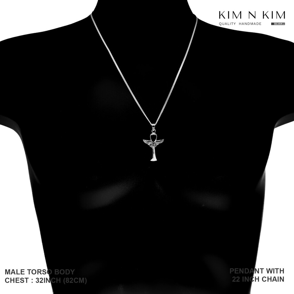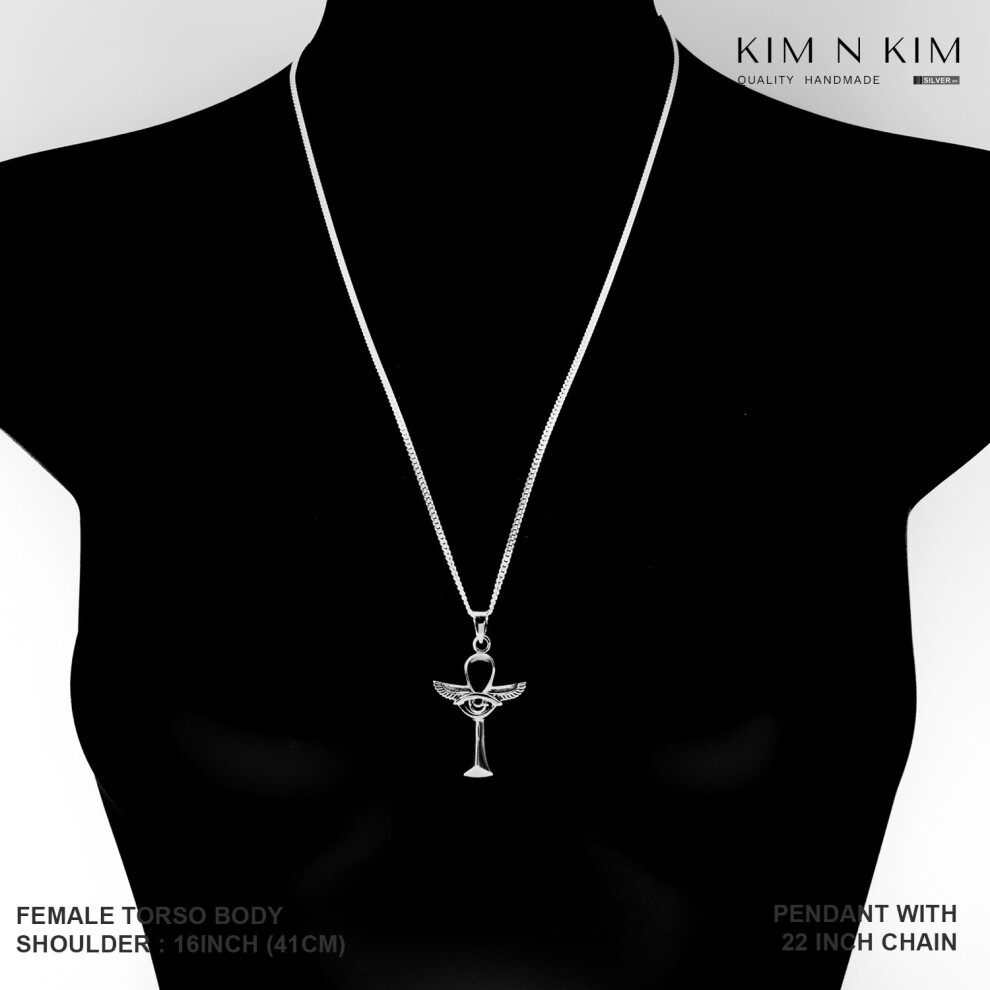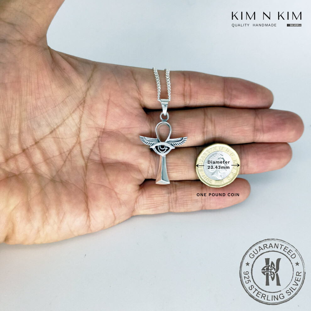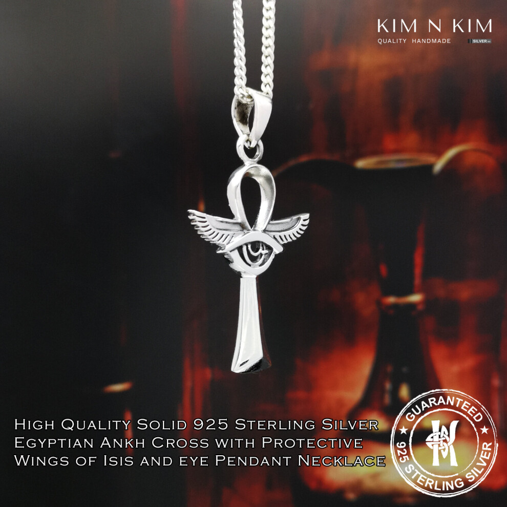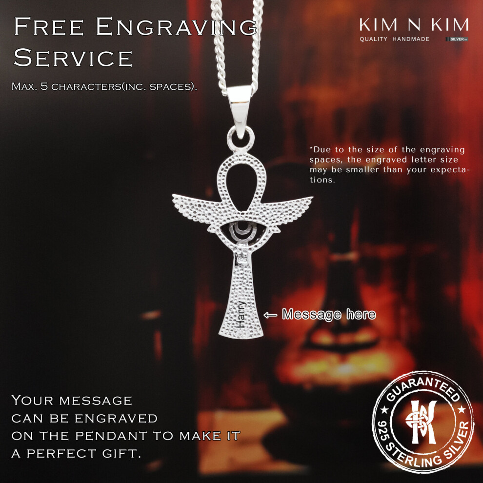 (22 inches) Egyptian Ankh Cross with Protective Wings of Isis and Eye Pendant Necklace /Free Engraving /Solid 925 Silver Description