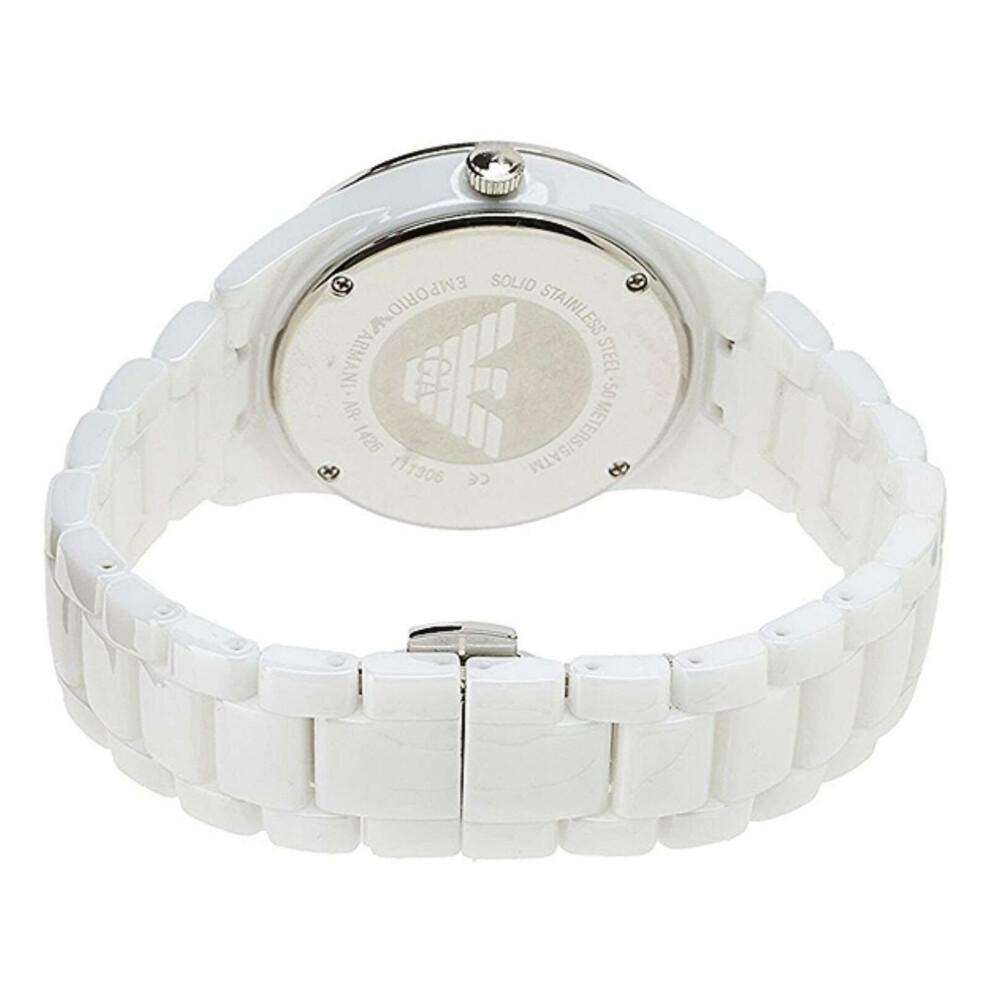 Emporio AR1456 is a beautiful and attractive Ladies watch . Case is made out of Ceramic while the dial colour is Mother of pearl. The features of the watch include (among others) a chronograf and date function. This model has got 50 metres water resistancy – it can be submerged in water for periods, so can be used for swimming and fishing. It is not reccomended for high impact water sports. We ship it with an original box and a guarantee from the manufacturer.