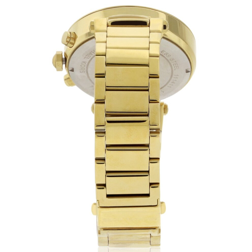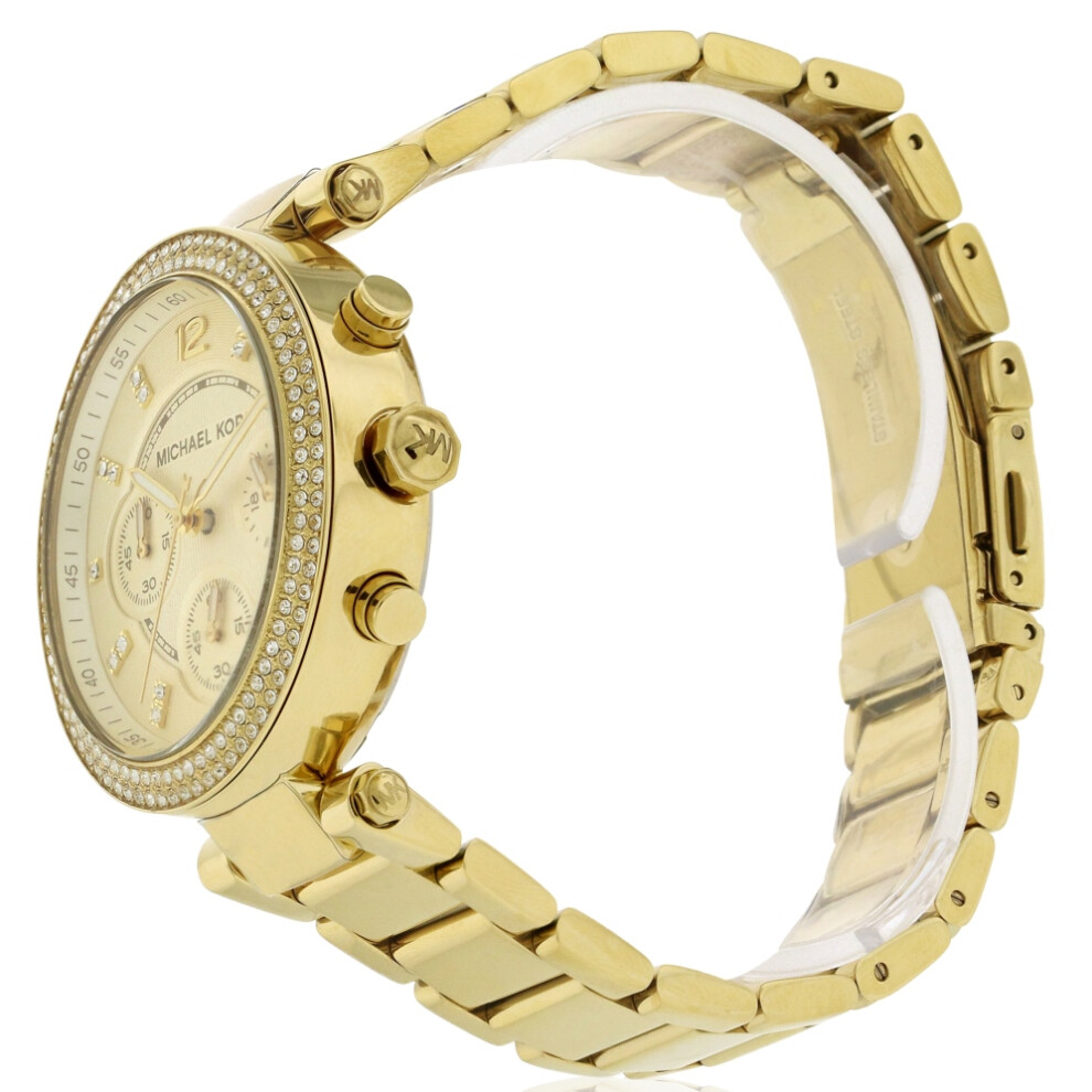 Two rows of eye-catching crystals rotate on the distinct bezel of a bracelet watch. Luxurious crystal markers add flare to a textured dial with a three-eye chronograph and date window. Tri-fold buckle with spring-lock closure. Case diameter 39mm. Quartz movement. Water resistant 100 meters.